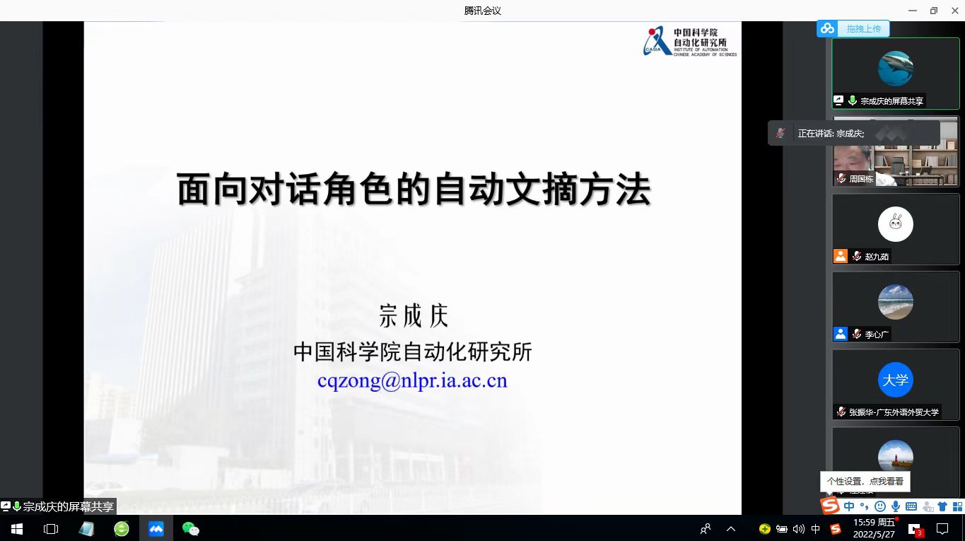 2022年3月27日下午,通过腾讯视频会议的方式,中国科学院自动化研究所研究员、广外云山讲座教授宗成庆老师为广外师生做了一场题为“面向对话角色的自动摘要方法”的讲座。讲座由语言工程与计算实验室主任李心广主持,校内外相关研究方向的老师和学生参加了此次讲座。