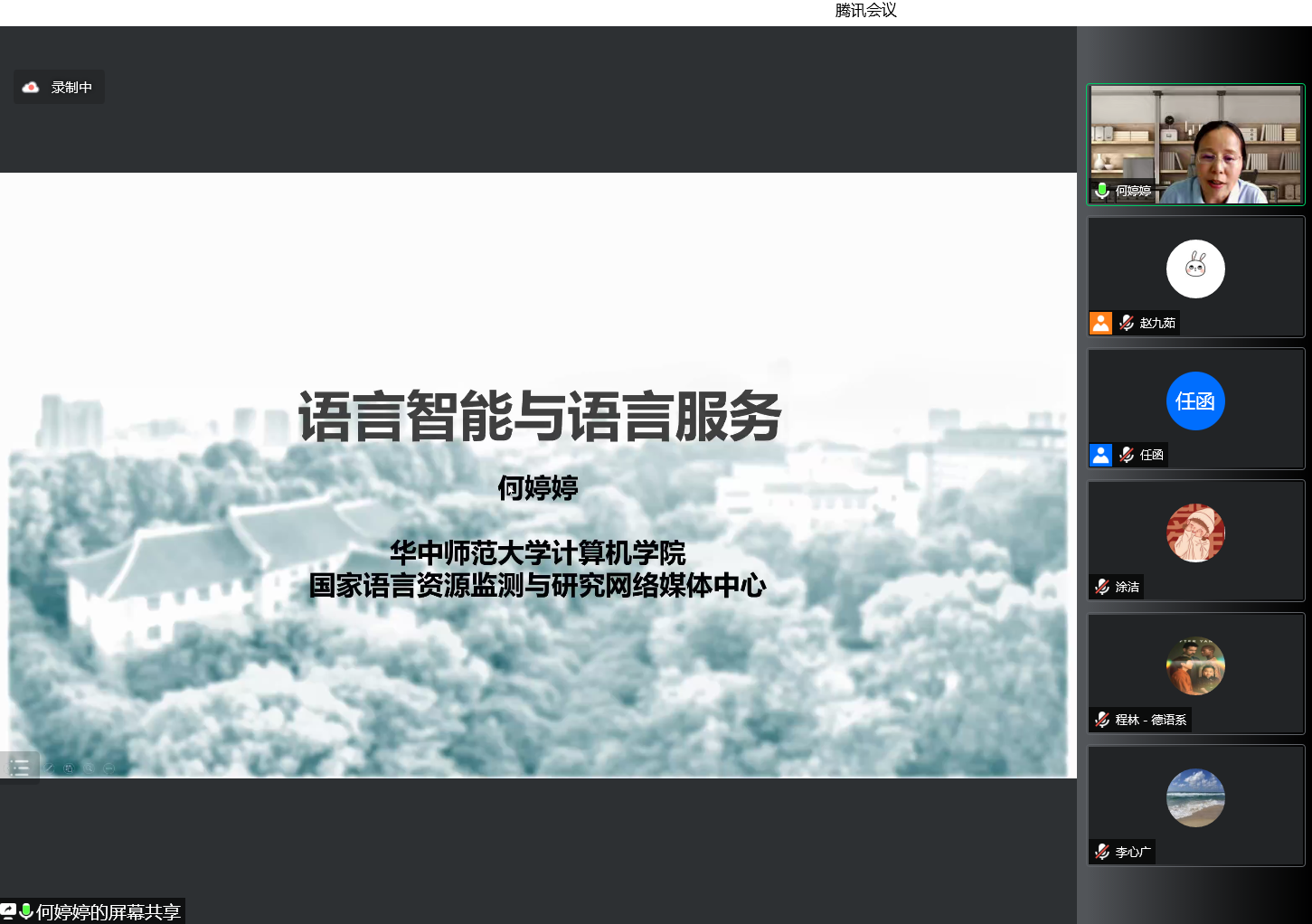 2022年6月2日,由人事处、教师发展中心主办,语言工程与计算实验室承办的著名教授论坛第558讲通过腾讯视频会议的方式举行。华中师范大学计算机学院何婷婷教授受邀做客我校著名教授论坛,为广外师生带来了一场题为“语言智能与语言服务”的学术讲座,讲座由语言工程与计算实验室专职研究员任函副研究员主持。